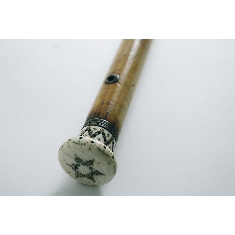 A LATE 17TH / EARLY 28TH CENTURY MALACCA WALKING CANE with an ivory, pique-work knop, a reeded brass ferrule and a brass "eye" to take a strap; 35.7" (90.5 cms) long