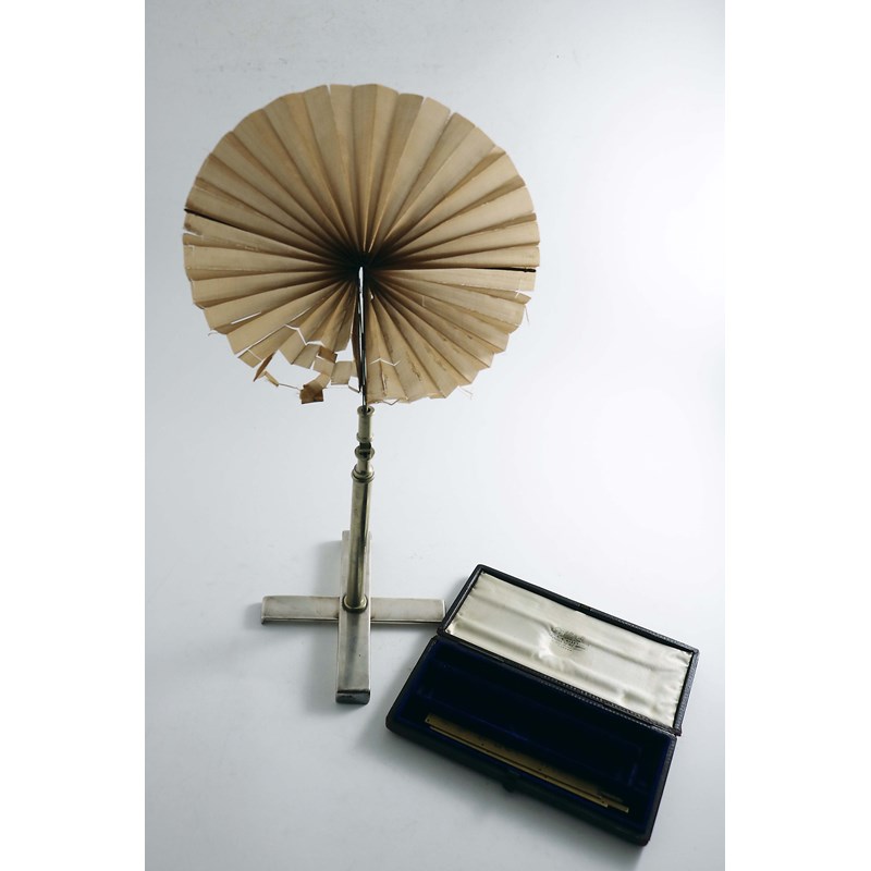 with two brass sticks (to take a folding silk screen or shade), by C.W. Dixey, also contained in the box a George III mounted folding face screen by T. Phipps & E. Robinson, London 1793; the latter 4.75" (12 cms) long (closed)
