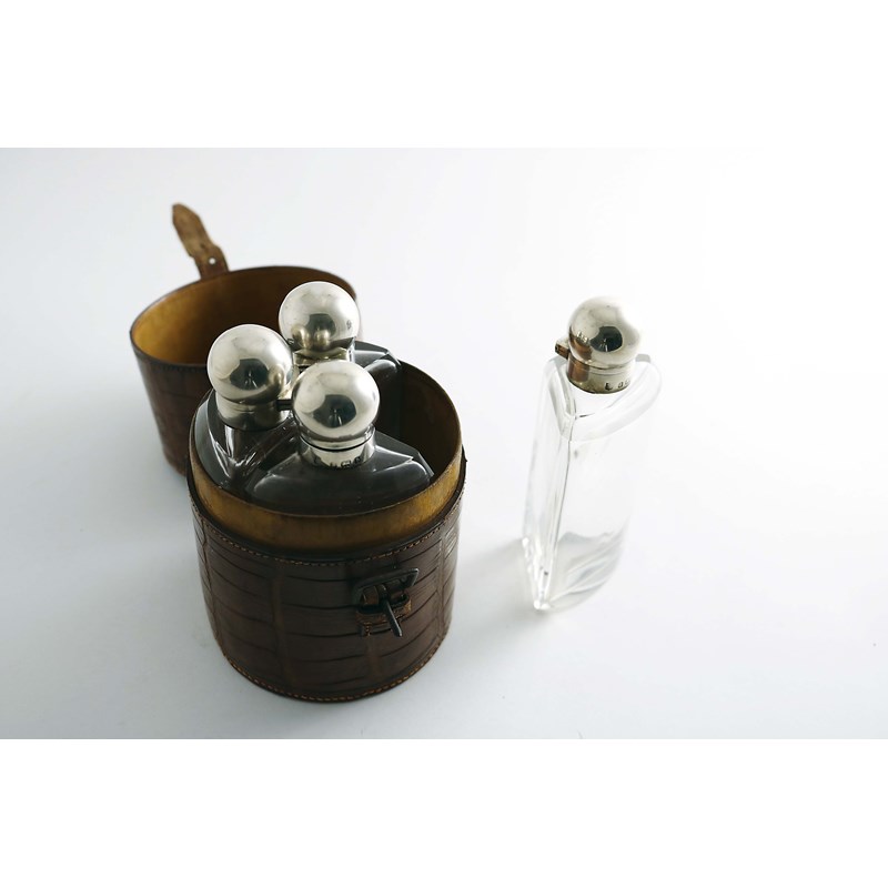 in the form of four mounted clear glass bottles with stoppers, each sector-shaped to fit into a crocodile leather travelling case, by A & J. Zimmerman, Birmingham 1901; 5.25" (13.5 cms) high overall