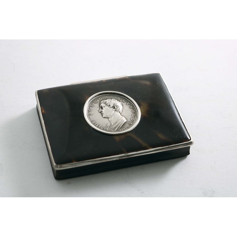 of rectangular outline with a stand-away hinge & a reeded border, the cover inset with a later medal depicting a classical portrait bust of Sir Joshua Reynolds, the box unmarked, c.1720; 3.2" (8 cms) long