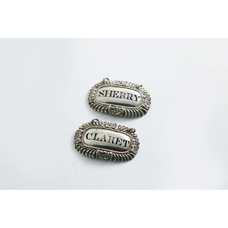 A PAIR OF GEORGE IV WINE LABELS with gadroon & floral borders, pierced "CLARET" and "SHERRY" by C. Rawlings, London 1824; 2" (5 cms) long; 1.3 oz (2)