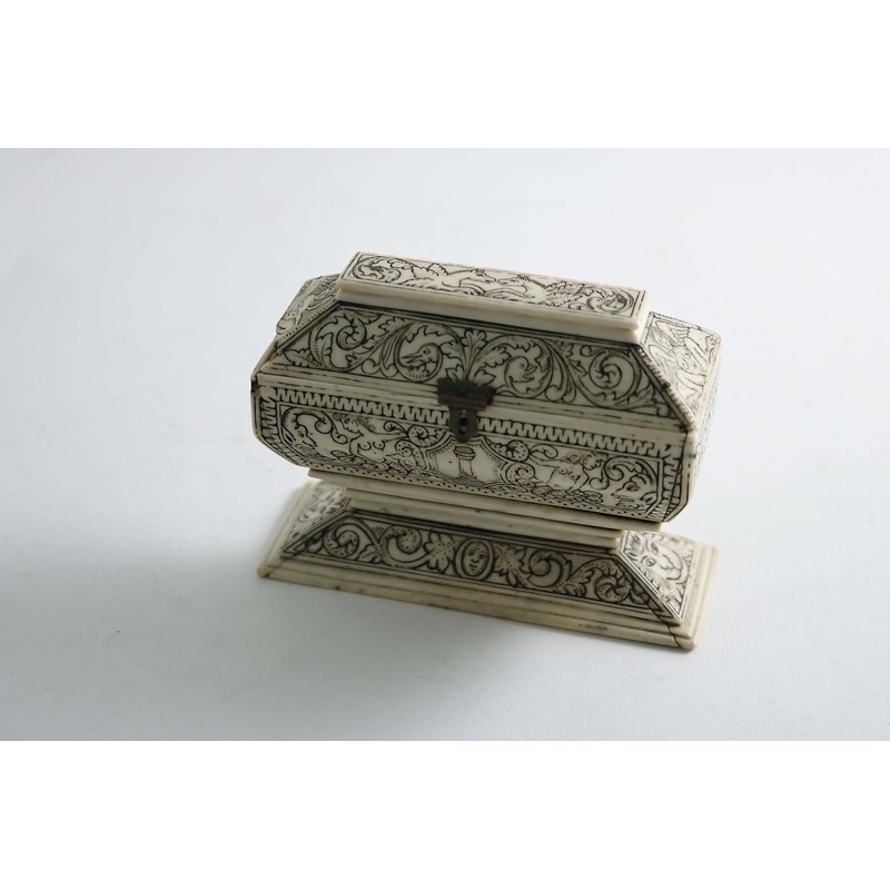 with a bevelled rectangular cover and base, the whole decorated with formal engraving infilled with black pigment, with copper hinges and hasp closure; 4.1" (10.5 cms) long