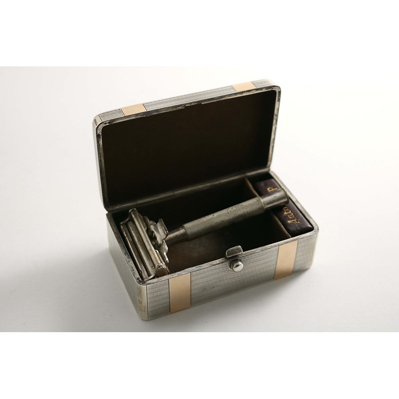 of rounded oblong form with a button thumbpress, decorated with engine-turning and two rose gold bands, initialled "O" and "S", the interior fitted with a plated safety razor and blades, by Sampson Mordan & Co., London 1912; 4" (10 cms) long
