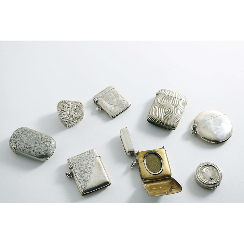 with a hinged flap on one side concealing an oval miniature photograph frame, gilt interior, by J.M.Banks,Birmingham 1897 together with three other vesta cases, two plated vesta cases and two pill boxes, the round vesta case 1.75" (4.5 cms) diameter (8)