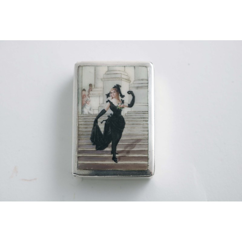 A Victorian rectangular vesta case, enamelled on the cover with an image of Fanny Legrand in a black dress on a flight of stone steps*, the reverse monogrammed, gilt interior, by Horton & Allday, Birmingham 1887; 1.8" (4.6 cms) long; 1 oz