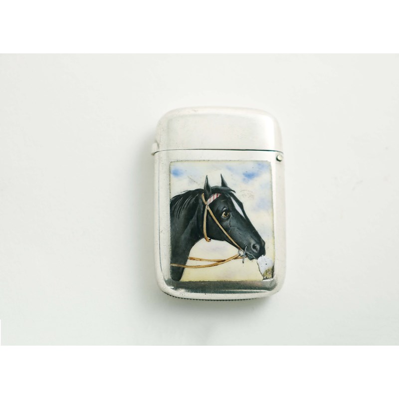 of rounded rectangular form, enamelled on the cover with the portrait of black horse with a star on its forehead, by C.H. Cheshire, Birmingham 1891, (lacking internal spring) ; 2" (5 cms) long; 0.6 oz