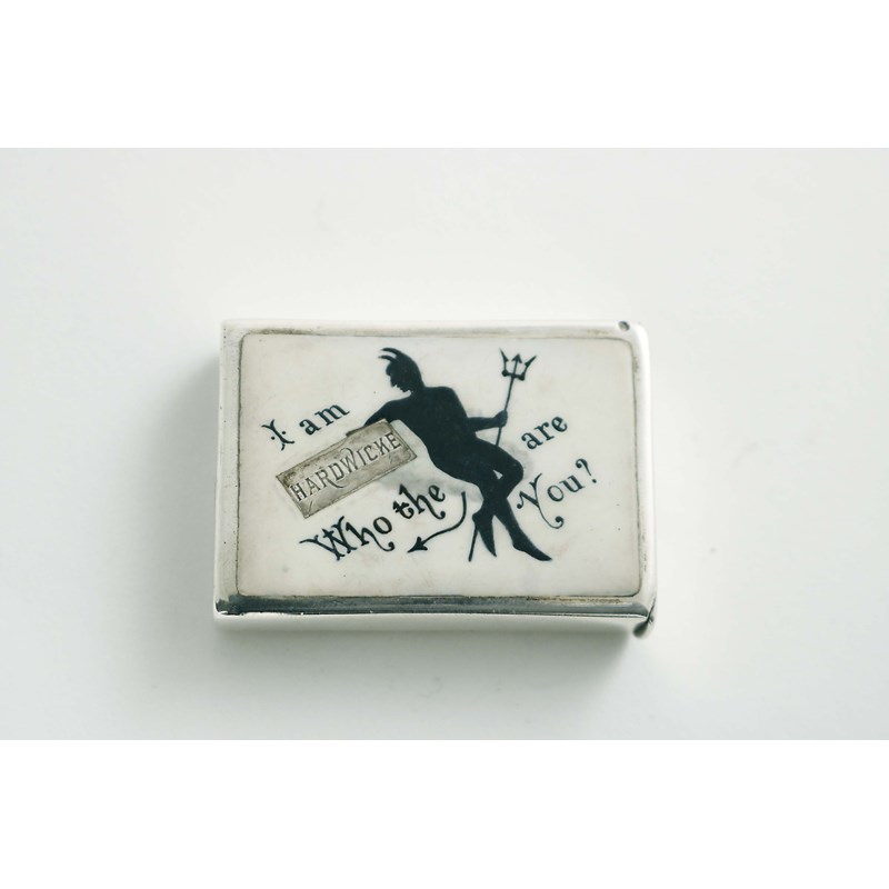 with a flip cover, enamelled on the front in monochrome with "I am Hardwicke who the (devil) are you", the reverse monogrammed, by John Millward Banks, Birmingham 1894;  1.75"  (4.5 cms) long;  1.1 oz