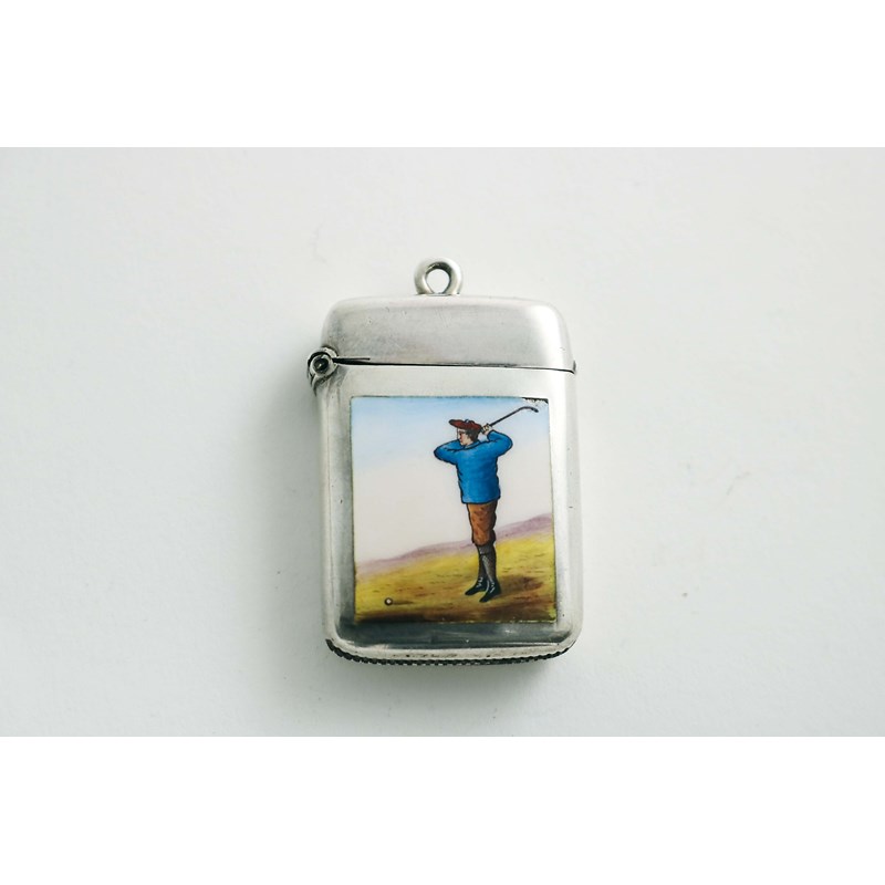 rectangular with rounded corners, enamelled on the front in polychrome with a golfer on the links, taking a swing, by S. Blankensee & Sons, Birmingham 1894; 1.55" (4 cms) long; 0.55 oz