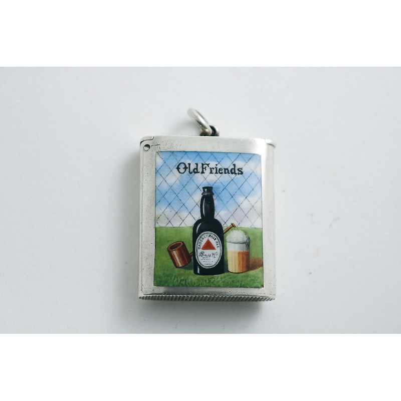 rectangular with rounded sides, a suspensory ring and a flip cover, the front enamelled in polychrome with a pipe, a bottle and a glass of Bass pale ale below the heading "Old Friends", gilt interior, no visible maker's mark, Birmingham 1905; 1.5" (4 cms) long; 0.9 oz