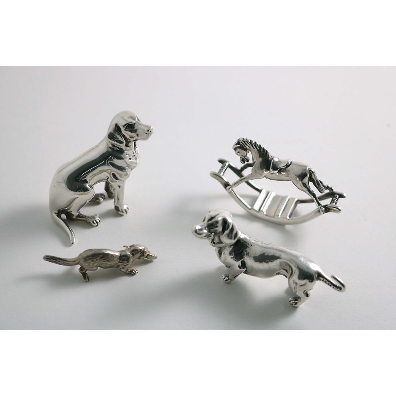 sitting upright by Sarah Jones, London 1993, a miniature model of a rocking horse by the same maker, London 1989, a miniature figure dachshund with import marks for Chester 1907 and another miniature; an otter with a fish in its mouth; the labrador 1.8" (4.6 cms) high; 6.75 oz (4)