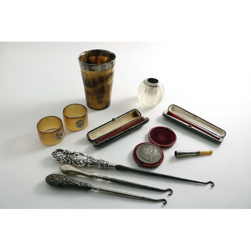 An Edwardian mounted horn beaker, a pair of Scottish, mounted horn napkin rings, unmarked, three mounted steel button hooks, a 9 ct. gold mounted cheroot holder (cased), another cheroot holder (cased), a mounted horn cheroot holder, a French architectural school prize medal (cased) and an Edwardian mounted, ribbed glass vesta ball; the latter 2.2" (5.4 cms) high (11)