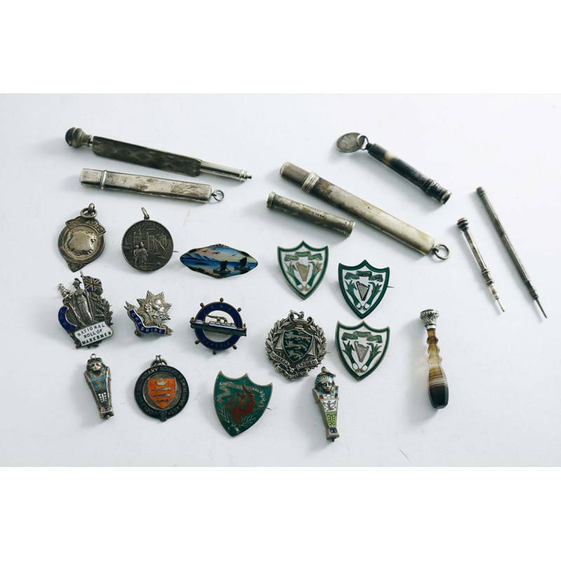 most decorated with enamel (R.M.S. CAMBRIA, National Roll of Marksmen, Welsh examples, etc.), a Norwegian enamelled brooch, a mounted agate seal, various pencils (some plated, etc.; the seal 2" (5 cms) long; 3.25 oz weighable silver (22)