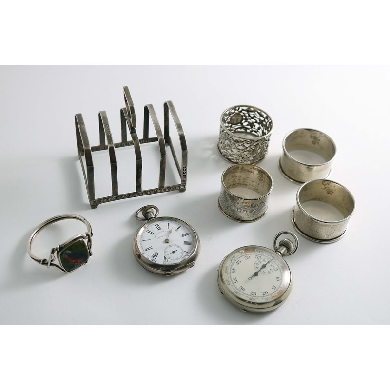 A Chinese engraved napkin ring, initialled "G", a Chinese pierced napkin ring, a pair of engine-turned napkin rings, a small toast rack, a pocket watch, a plated stop watch and a small unmarked bangle/napkin ring with enamel; the latter 2" (5 cms) diameter; 5 oz weighable silver (8)