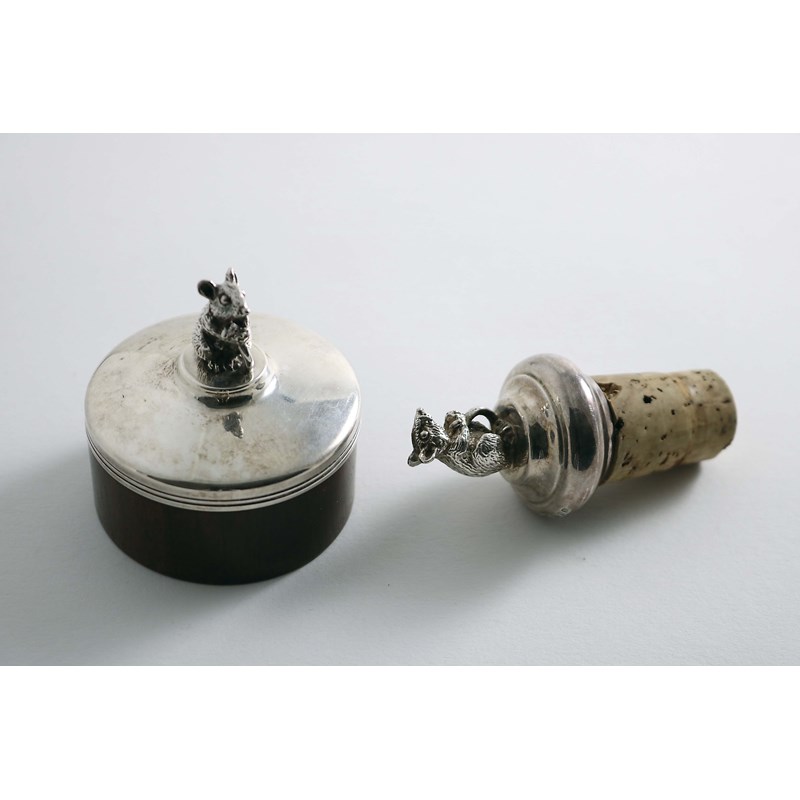 circular with a lift-off cover & mouse finial by Brian L. Fuller, London 1985 (with his tradmark glis-glis mark) and a mounted bottle cork by the same maker, London 1991; the box 2" (5 cms) diameter (2)