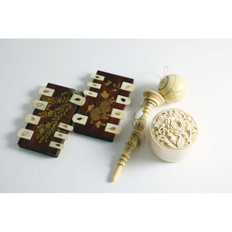 A PAIR OF JAPANESE ROSEWOOD AND IVORY SHIBAYAMA BEZIQUE MARKERS; 9 cms, an ivory box with carved cover, c.1900 and an ivory turned cup & ball, 19th century.