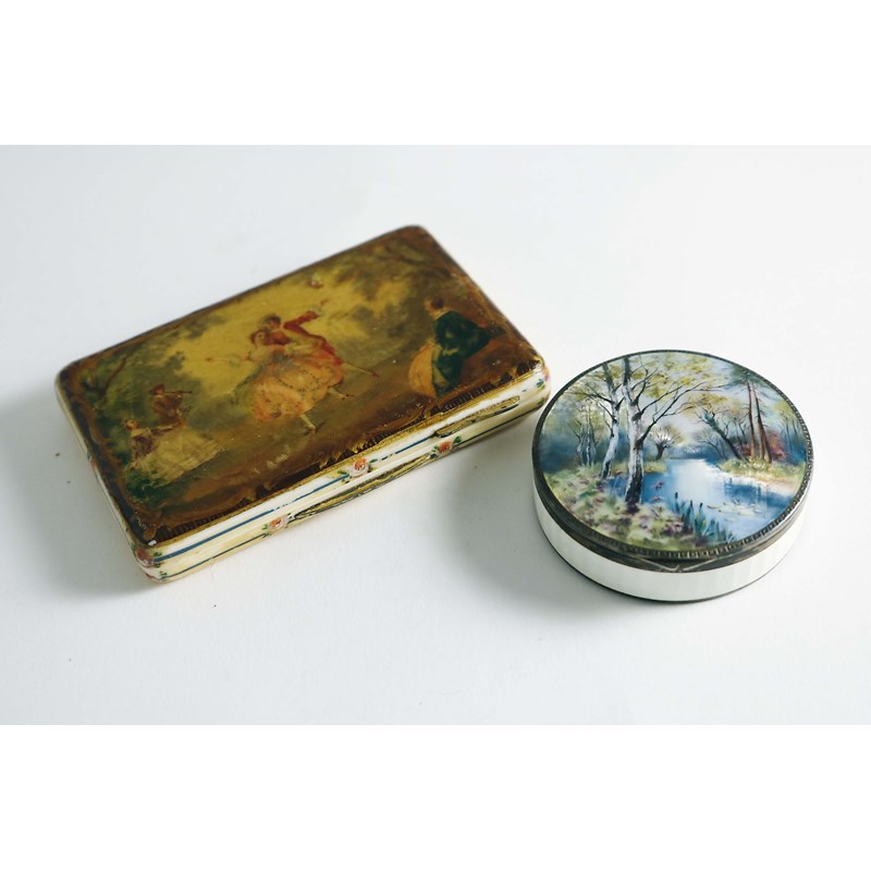 The cover painted with trees and a river, white guilloche sides, import marks dated 1924; 5.5 cms dia. and an ivory cigarette case painted with a fete champetre (2)