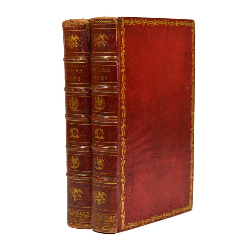 Bewick, Thomas. A History of British Birds, 2 volumes, third edition of Land Birds, second edition of Water Birds, PRESENTATION COPY, inscribed 'The Gift of Bewick, to his Daughter Isabella Bewick, 1st Jan.y 1814', woodcut illustrations throughout, contemporary crimson straight-grained morocco by Lubbock of Newcastle, decorated gilt with rolled-tool border of leaves and floral motifs, the spines with bird motifs in compartments, the joint of volume 2 weakened, 8vo, Newcastle: Edward Walker for T. Bewick, 1805