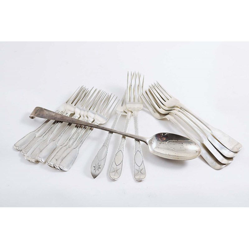 Three bright-cut Star table forks (Victorian & later), a Hook-end basting spoon by Michael Keating, Dublin 1770, a set of four Fiddle table forks, crested, and nine various dessert forks, mixed makers & dates;  29 oz  (17)