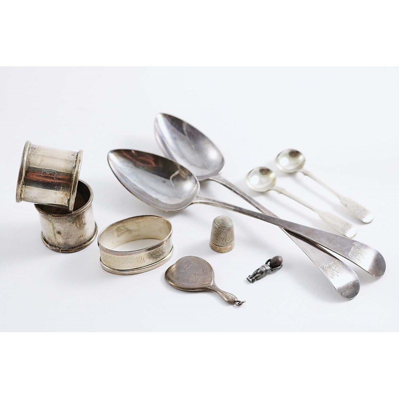 A pair of George III Old English pattern table spoons, initialled, by Peter & Anne Bateman, London 1795, a pair of plain napkin rings, a single napkin ring, initialled, a pair of Exeter-made salt spoons, initialled, a thimble, a miniature hand mirror and a miniature "FUMSUP" figure; the latter 1.2" (3 cms) long; 8.5 oz (10)