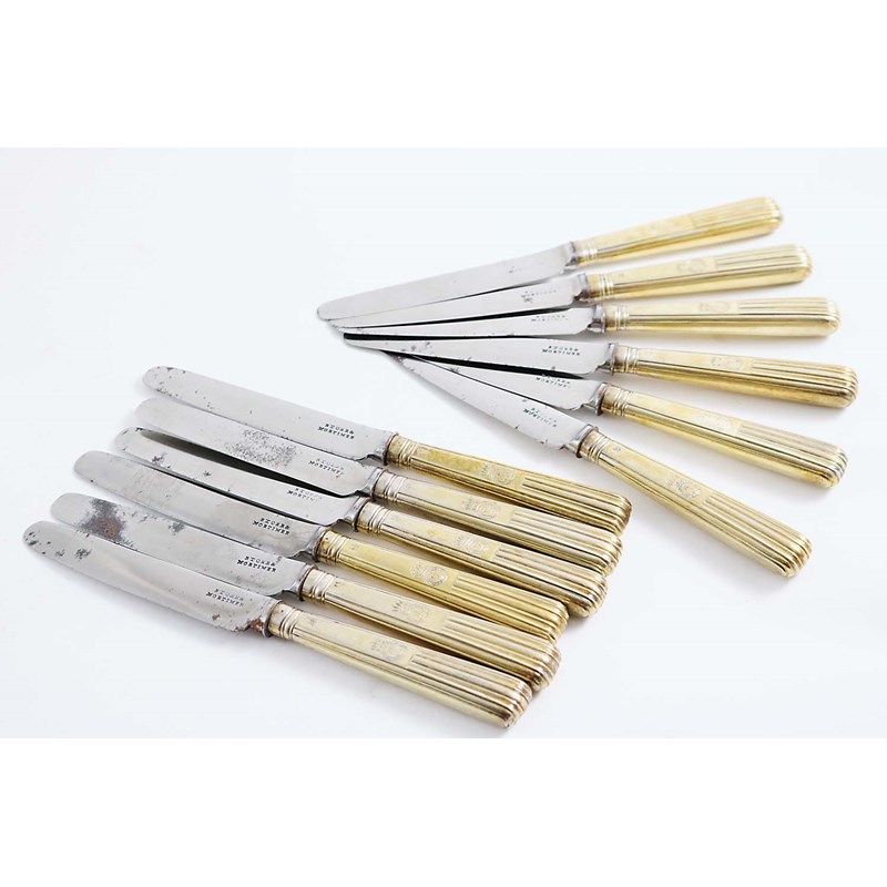 A MATCHED SET OF TWELVE GEORGE III / GEORGE IV SILVERGILT SIDE KNIVES with part-reeded handles, crested (steel blades) by various makers, mixed dates, London 1815-1825, the blades by "STORR & MORTIMER"; 8.25" (21 cms) long (12)