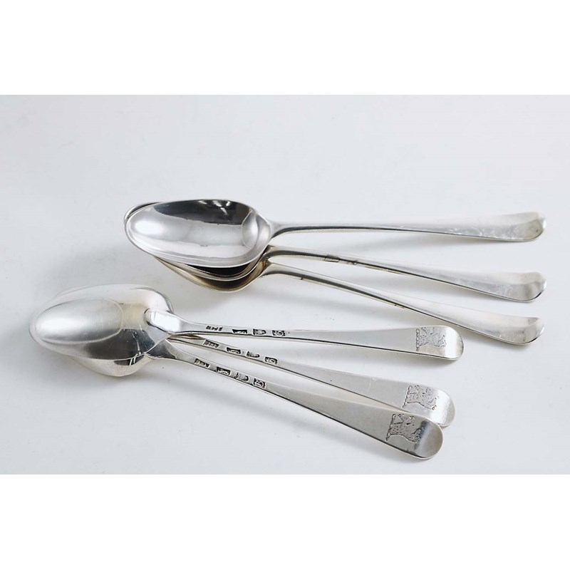 A SET OF SIX EARLY GEORGE III DESSERT SPOONS Hanoverian pattern, crested, by James Tookey, London 1762; 7.1 oz (6)