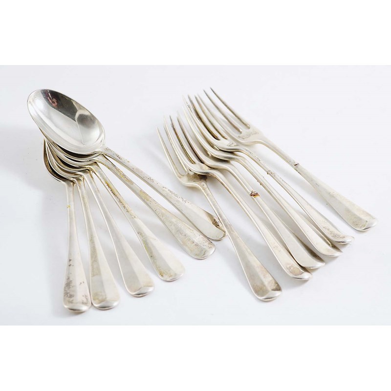 A MATCHED SET OF SIX HANOVERIAN PATTERN DESSERT FORKS (Three prong) and six dessert spoons by two makers (Mappin Brothers and Brewis & Co., London 1895/1911; 19.9 oz (12)