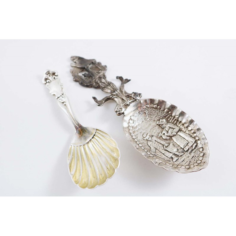 with peasant figures in the bowl, hallmarked by Maurice Freeman, London 1902, and a Victorian caddy spoon with a gilt, fluted bowl and a shaped stem by Messrs. Lias, London 1862; the latter 4"  (10 cms) long;  1.7 oz  (2)