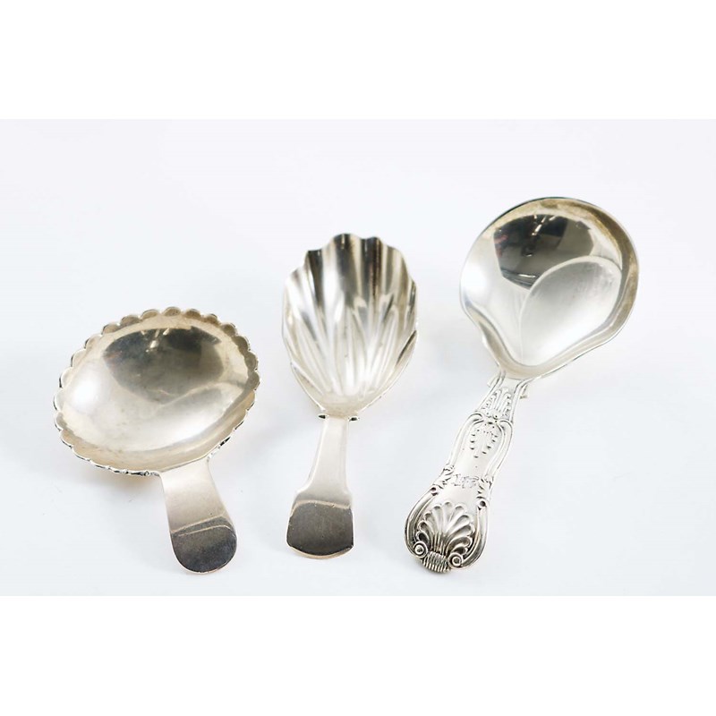 with a frilly edge to the bowl, by George Smith & Thomas Hayter, London 1799, a Fiddle spoon with fluting in the bowl by Francis Powell, London 1819 & a King's pattern caddy spoon, initialled "M", maker's mark unclear, London 1836; the latter 3.75" (9.5 cms) long; 1.65 oz (3)