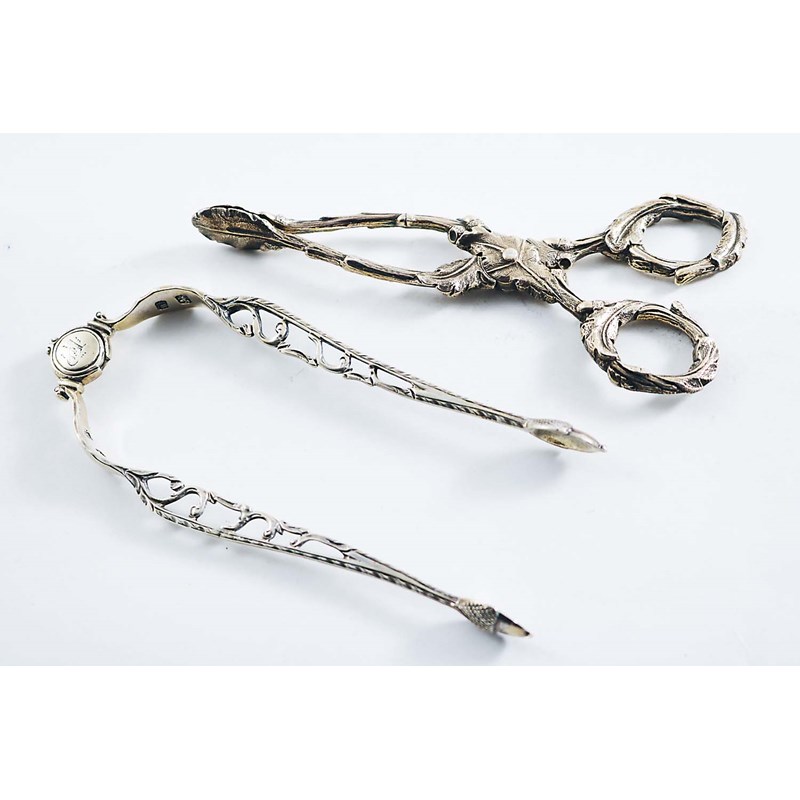 with a sprung pivot, initialled, maker's mark "BB", possibly Benjamin Bickerton, London c.1775 and a pair of naturalistic sugar nips by Messrs. Eley & Fearn, London 1823; the latter pair 5.1"  (13 cms) long;  3.1 oz  (2)