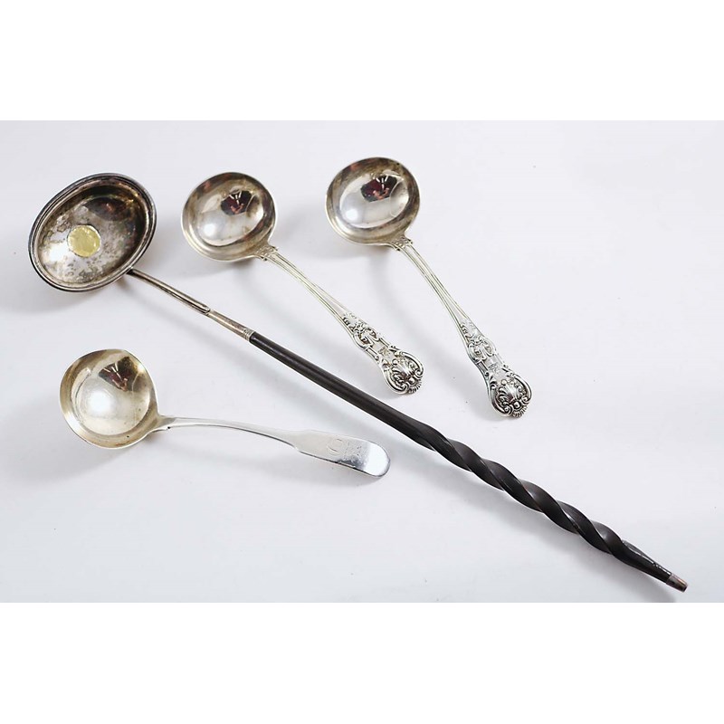 crested, by W.R. Sobey, London 1854, a George III Irish Fiddle sauce ladle, initialled & crested and a George III punch ladle with a whalebone handle (the bowl inset with a gold coin);  the latter 16"  (40.5 cms); 8 oz weighable silver (4)