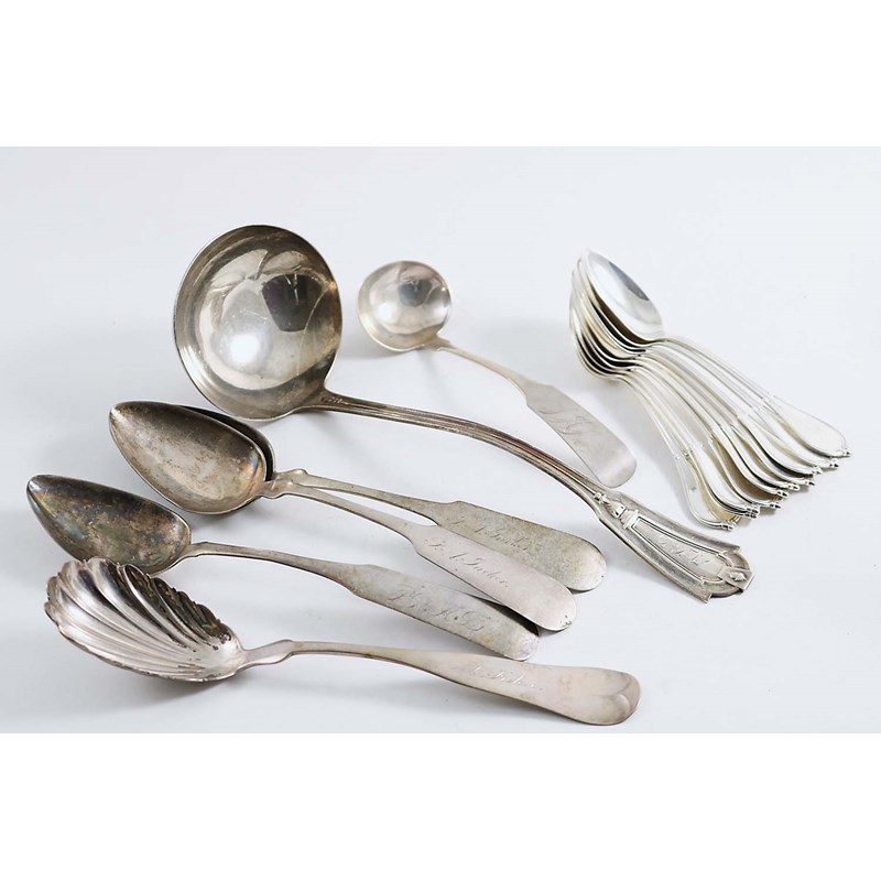 A set of ten tea spoons, initialled "T", a small soup ladle, initialled, a "coin" table spoon, initialled, a sauce ladle, inscribed "Lelia from Grandfather" and three other spoons with inscribed names or initials (the latter four pieces made by either P. or H.F. Miller, of Providence, Rhode Island; the soup ladle 10.8" (27.5 cms) long; 16.2 oz (16)