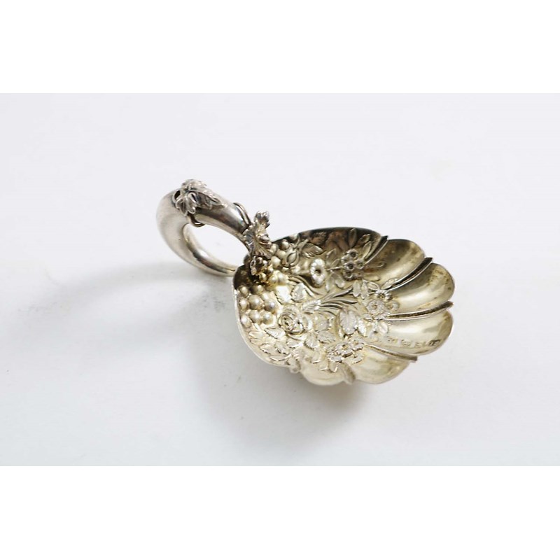 with embossed fruit and flowers in the bowl and a crescent handle with applied vine leaves, by George Unite, Birmingham 1860; 2.75" (7 cms) long; 0.4 oz
