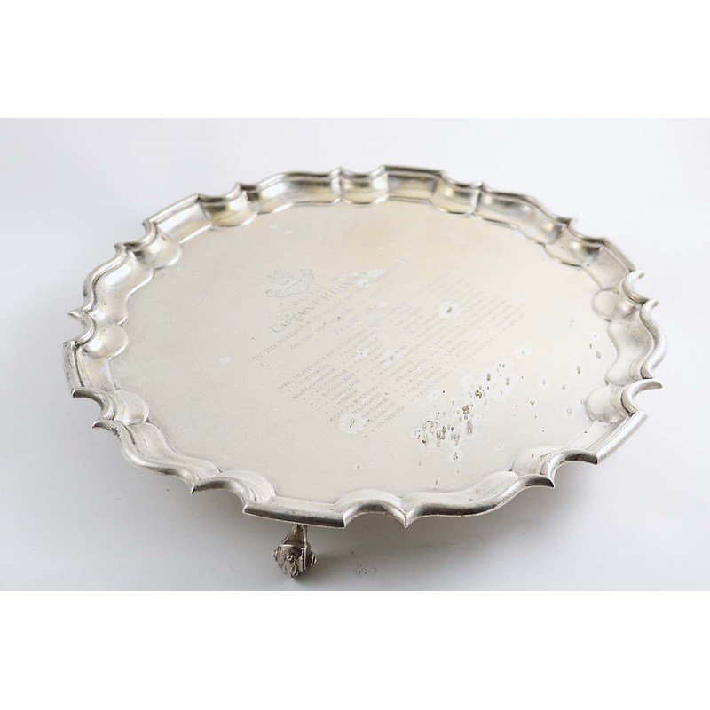 A LARGE EARLY 20TH CENTURY SALVER of shaped circular outline with a moulded border and scroll feet, inscribed, by the Goldsmiths & Silversmiths Co.Ltd., London 1912; 16.25" (41.4 cms) diameter; 66.5 oz