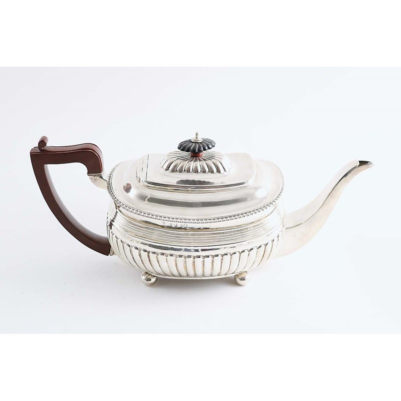 A GEORGE III PART-FLUTED TEA POT of rounded oblong form on ball feet, with an angular handle and a gadrooned border by Crispin Fuller, London 1813; 5.7" (14.3 cms) high; 18 oz