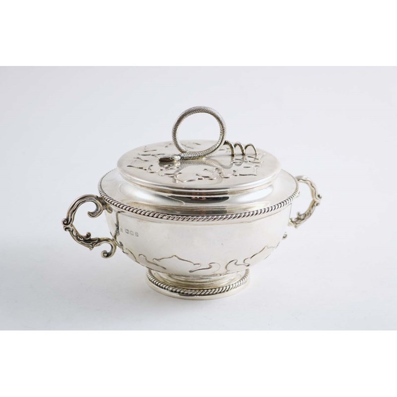 AN EARLY 20TH CENTURY REPRODUCTION OF A CHARLES II CAUDLE CUP & COVER with cut-card work, scroll handles and a serpent ring handle on the cover, by Wakely & Wheeler, London 1919; 5" (12.5 cms) diameter; 15.3 oz