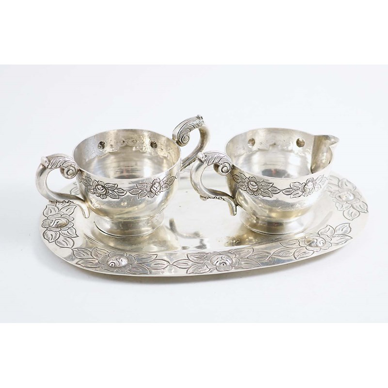on a matching oval tray with chased floral decoration, maker's mark of "Heather"; the tray 9.5" (24 cms) long; 22.6 oz (3)