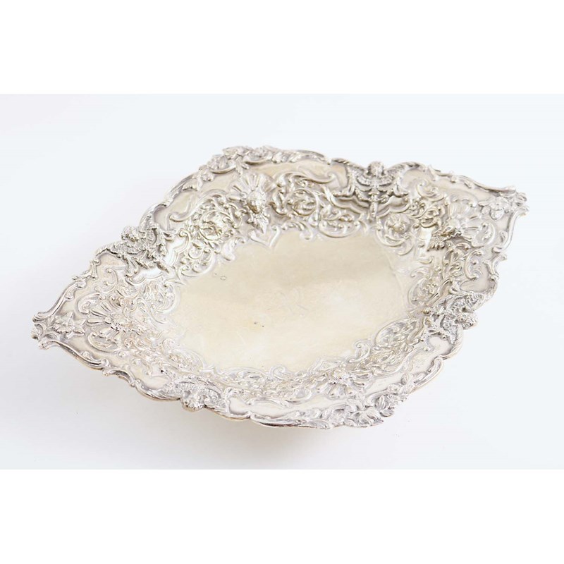of navette outline with an applied border, initialled "R" in the centre, maker's mark "J.F", Glasgow 1899; 11.25" (28.5 cms) long; 11.1 oz