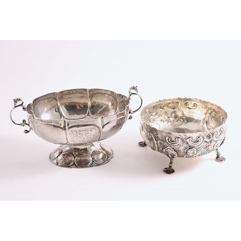 of lobed oval form on a domed foot with an engraved coat of arms and English import marks for Sheffield 1896 and a Victorian embossed sugar bowl on four feet, crested, by D & C. Houle, London 1877; the latter 5" (13 cms) diameter; 14.4 oz (2)