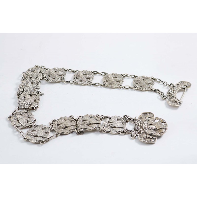 AN EDWARDIAN BELT consisting of linked cast panels, each pierced with a Kingfisher and flowers, by Synyer and Beddoes, Birmingham 1903; 25.75" (65.5 cms) long; 5.8 oz