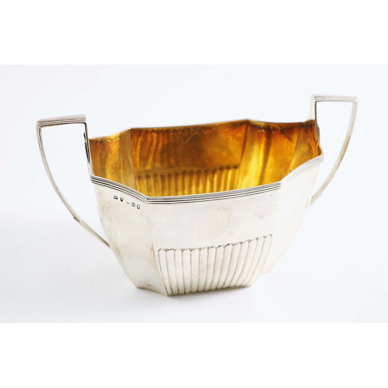 A GEORGE III SUGAR BASIN with two angular handles, part-fluting and a gilt interior, probably by John Robins, London 1799; 7.9" (20 cms) long; 10.2 oz