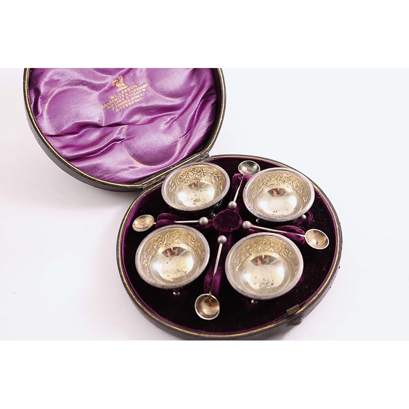 A LATE VICTORIAN CASED SET OF FOUR SMALL CIRCULAR SALTS