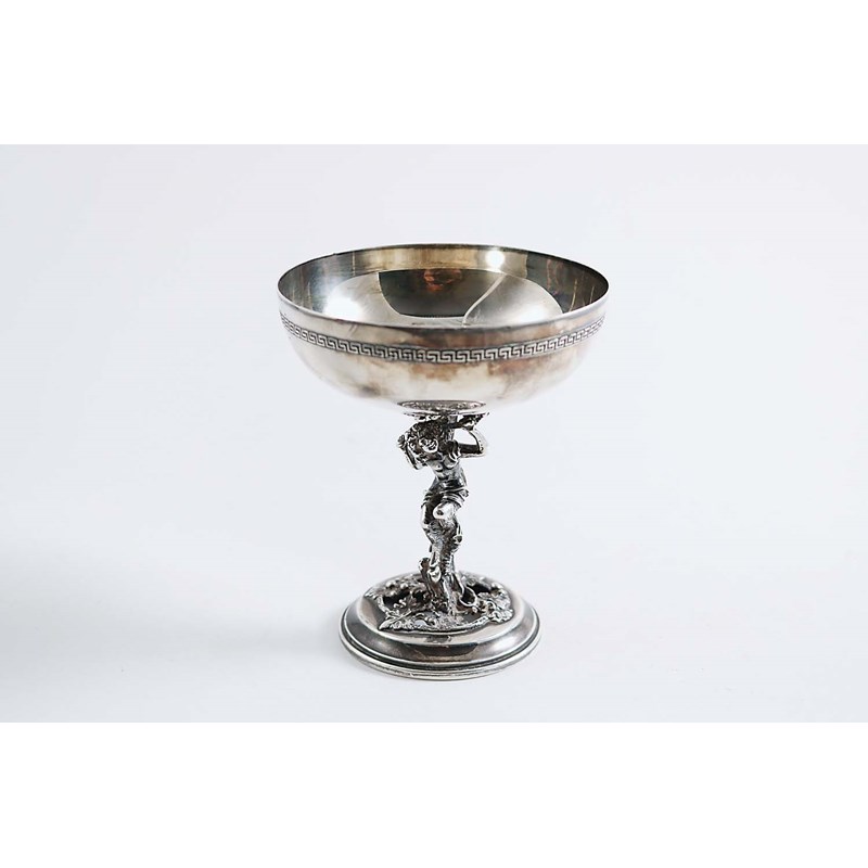 A 20TH CENTURY SPANISH GOBLET with a shallow circular bowl, the stem cast with a satyr figure on a grape vine; 4.75" (12 cms) high; 6.4 oz