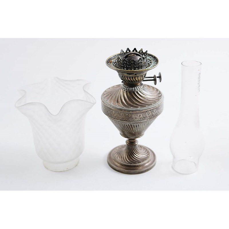 with wrythen-fluted decoration and bead borders, with plated gallery fitting, a glass chimney and associated glass shade by Hawkesworth Eyre & Co.Ltd., Sheffield 1893 (loaded base); 8" (20 cms) high