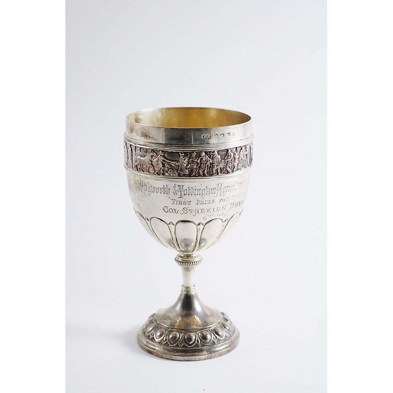 A VICTORIAN PRIZE OR TROPHY GOBLET with part-fluting and a figural frieze below the rim, gilt interior, the front inscribed, by Frederick Elkington, Birmingham 1889; 7.3" (18.6 cms) high; 11.65 oz
