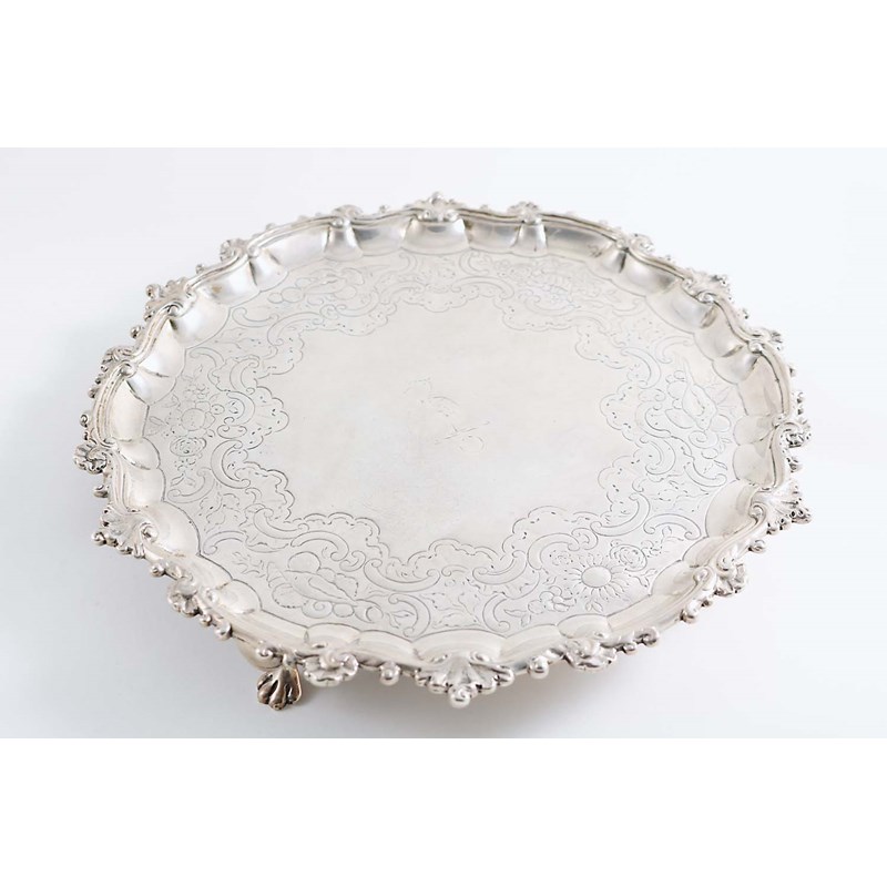 of shaped circular outline with a cast husk & scroll border and flat-chased decoration around the centre, crested, by James Glen, Glasgow (S, IG, town mark, IG) 1745-50; 11" (28 cms) diameter; 25.6 oz