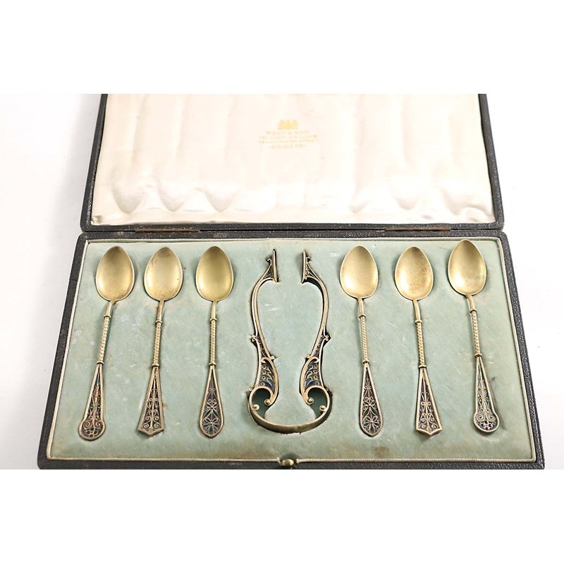 AN EARLY 20TH CENTURY NORWEGIAN CASED SET OF SIX SILVERGILT COFFEE SPOONS and a pair of matching sugar tongs, with plique-a-jour decoration, by J. Tostrup, c.1900; the tongs 4.25" (10.8 cms) long; 2 oz