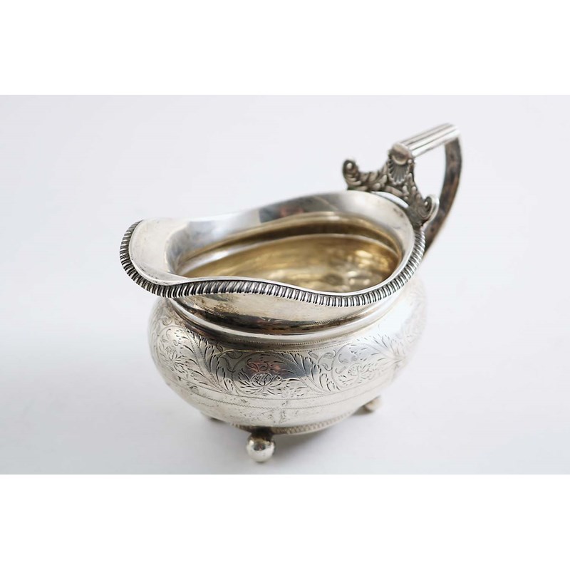 on ball feet with an engraved frieze around the upper body and a reeded handle terminating in a shell & foliate scroll where it meets the rim, maker's mark "?W", Newcastle 1820; 3.8" (9.7 cms) high; 4.3 oz