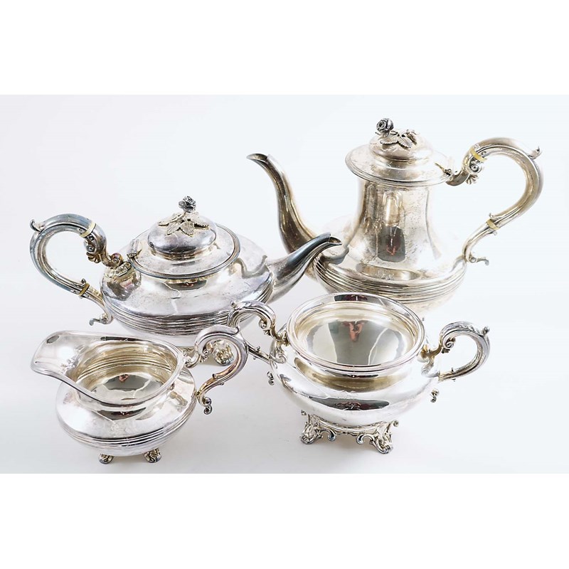 The plain circular bodies with a moulded reeded girdle, c-scroll handles and decorative feet, by Benoni Stephens, London 1834/35, together with an early Victorian sugar bowl of a similar form (but non-matching), by Messrs. Barnard, London 1842, all crested to match; the coffee pot 8.4" (21.4 cms) high; 74 oz (4)