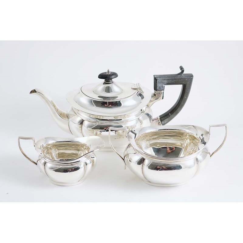 AN EARLY 20TH CENTURY THREE-PIECE TEA SET of lobed oval outline with angular handles, by C.S. Green & Co., Birmingham 1911; the tea pot 5.7" (14.4 cms) high; 27.4 oz (3)