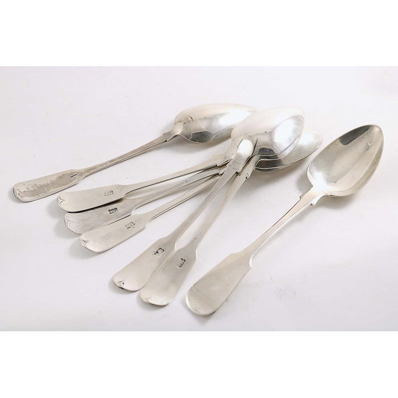 A set of six early 19th century Fiddle table spoons by T. De Gruchy and J. Le Gallais of Jersey, and another by C.W. Quesnel; 11.5 oz (7)